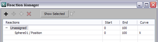 After assigning a Reaction controller, right-click the track and then choose Properties, or choose Animation Reaction Manager, to open the Reaction Manager dialog.