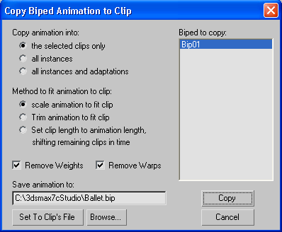 The Copy Biped Animation To Clip dialog opens when you select one or more clips on a track and choose Load Source From Biped on the Clips menu The animation from the biped replaces the selected clips.