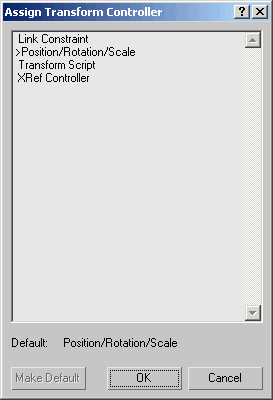Choose a controller type from the Assign ... Controller dialog. Depending on the type of track currently highlighted, the dialog lists a subset of the different types of controllers.
