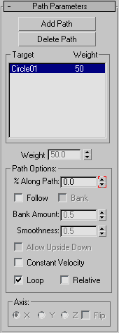 Path Parameters rollout. On this rollout you can add or delete targets, assign weighting, and animate each target's weight value.