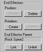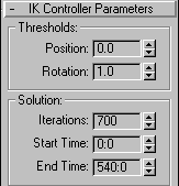 In the IK Controller Parameters rollout, you specify the accuracy of the IK solution and the frame duration of the solution. For bones that compress, you generally want an accurate solution to ensure that the bone follows the end effector perfectly, without any drift. In the image of the rollout Position has a value of 0, the least amount of allowable distance (Rotation is at its default value of 1, the Rotation End Effector is not used in this example). Iterations is set high, ensuring that that the solution is accurate, even if the character is scaled down a great deal. Start and End Time should span the animation.