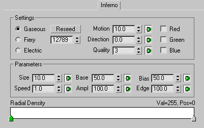 - When you animate the inferno, motion specifies how fast the inferno patterns move in the direction set by the Direction spinner. For example, if you want to simulate a raging fire, you want the fractal patterns to move upward. This parameter can be animated.