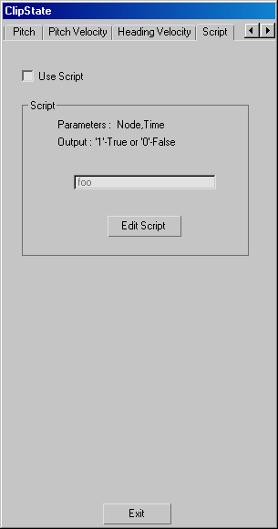 In the following sample script, "del" is the delegate's node, and "t" is the time. The name of the scripted function, "stoppedScript," would also need to be entered into the name field in the Script panel of the ClipState dialog. Unlike cognitive controller scripts, the statement "at time t" needs to be invoked because the animation is not running when the synthesis takes place.