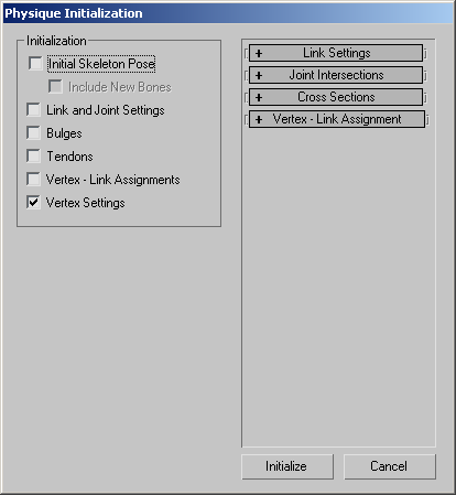 The toggles in the Initialization group of the Physique Initialization dialog are available only when you click Reinitialize.
