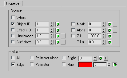 - Applies a highlight only to the perimeter of an object based on its alpha channel. Selecting this option highlights only the outside of an object without any spill on the interior. Whereas highlighting by Edge produces a spill onto the object, Perimeter Alpha keeps all of the edges clean because it relies on the scene alpha channel to derive it's effect.