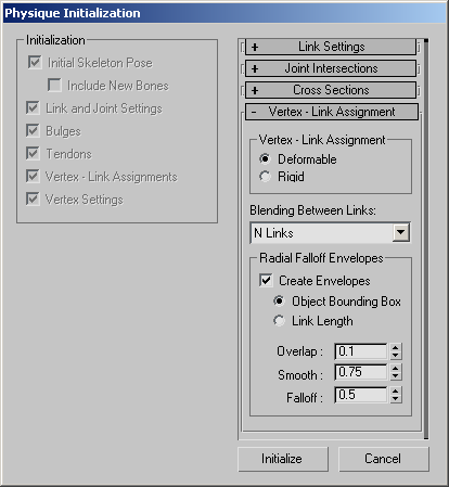 Use the Physique Initialization dialog to specify link parameters and the type and size of envelopes to create for Physique links.
