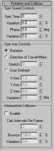 The options on this rollout affect the rotation of the particles, provide motion blur effects, and control inter-particle collisions.