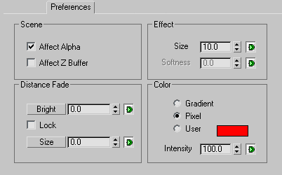 - Lets you fade the size of the glow effect based on the distance from the camera. In most circumstances, you want the overall size of the glow to diminish as it gets farther away from the camera. This parameter can be animated.