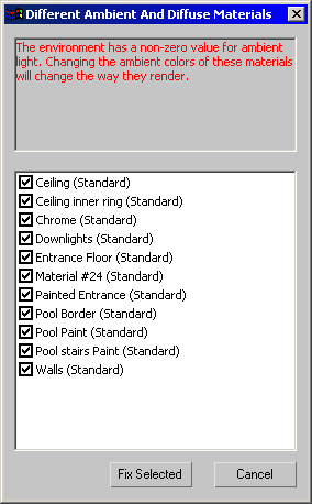 The Fix Ambient utility looks for standard materials in the current scene whose ambient and diffuse colors are different, presenting you with the option to copy the diffuse color to the ambient color channel. This will ensure that your renderings are consistent with earlier versions of products.
