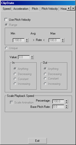 When you choose Unique, the motion synthesis engine activate the clip when the delegate's pitch velocity matches a specific value, optionally with a rising, falling, or constant value before or after the specified value.