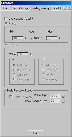 When you choose Unique, the motion synthesis engine activates the clip when the delegate's heading rate matches a specific value, optionally with a rising, falling, or constant value before or after the specified value.