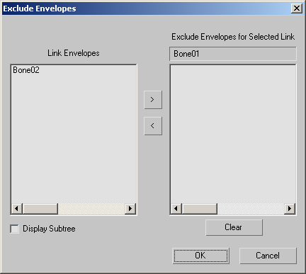 At the Envelope sub-object level, this dialog lets you exclude links from influencing other links. For example, you can exclude the right thigh link from influencing the left thigh link. Or, rather than scale the index finger envelopes to avoid influencing middle finger vertices, you might exclude the middle finger links from the index finger links.