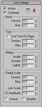 When Continuity is on, the effect of the link parameters passes smoothly across the joint to the connected link. When Continuity is off, Bend, Twist, and Radial Scale settings are limited to the current link, which produces an abrupt transition across the joint. This is analogous to breaking the spline handles on a spline shape.