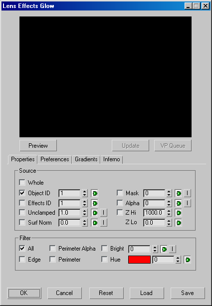 The Lens Effect Glow dialog contains four tabs: Properties, Preferences, Gradients, and Inferno