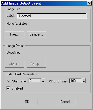 Image Output events send the result of executing the Video Post queue to a file or a device. You must add an Image Output event to the end of the queue if you want to save the final video. Otherwise, the results are displayed in the rendered frame window only. The Image Output event's range bar must include the entire range of frames you want to output.