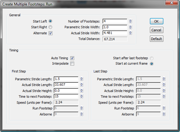 When Auto Timing is selected, these parameters are automatically adjusted to reasonable values. You control the footstep sequence by adjusting the Stride Length and Time to Next Footstep parameters.