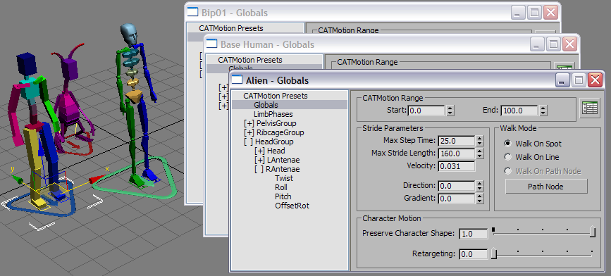 Each aspect of a particular motion (for example, the way the pelvis movees) has its own spline control. The combination of so many controllers allows for a wide range of possibilities in creating distinctive character animation.