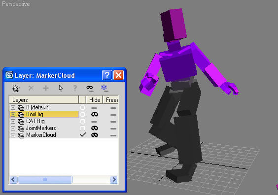 The second layer is the BoxRig, which defines the joint angles. Boxes are constrained to the joint positions and LookAt controllers define rotations. Note that the exact position of many of the bones is not important. For example, the knee joints move relative to the hip bone, but when this data is mapped onto the CATRig, the latter’s IK system effectively cleans up the motion and locks the joint locations.