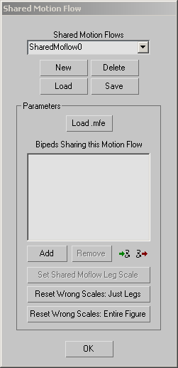 Add bipeds to the list of bipeds that share a motion flow. When you add a biped, its current motion flow graph and motion flow scripts will be deleted. It will now have the shared motion flow graph. A biped can only share one motion flow graph. You must remove a biped from its shared motion flow in order to add it to a different shared motion flow.