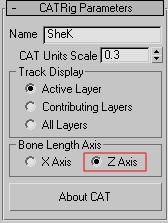 Initially CAT was designed to use the Z axis, which seemed logical at the time. However, many game developers requested that the software change from using Z to X. Most exporters are designed around exporting 3ds Max bones and biped, or Motion Builder characters, all of which use X. Often game physics engines would not work if the bone alignment was not X.