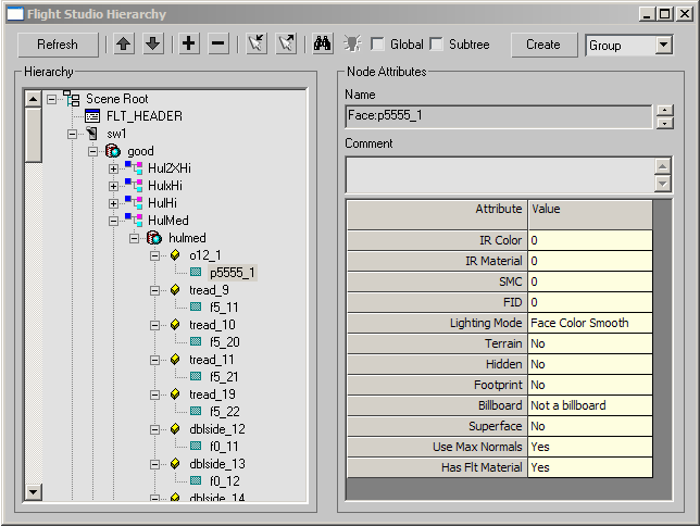The Hierarchy Browser dialog allows you to arrange, select, and edit the OpenFlight scene and attributes of its nodes.