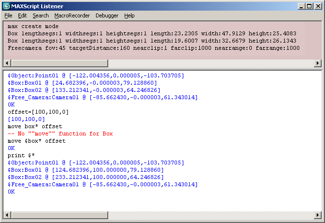 MAXScript commands entered in this window are executed immediately when you press the ENTER key in the numeric pad.