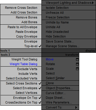 A number of Skin modifier commands are available from the quad menu on the Tools 1 and Tools 2 quadrants. These also appear on the Skin modifier rollouts and are described in the respective topics.