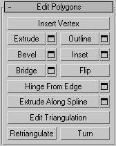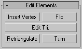 At the Element sub-object level, this rollout includes commands that are common to both polygons and elements. At the Polygon level, it contains those as well as a number more that are unique to polygons. The commands available at both levels are Insert Vertex, Flip, Edit Triangulation, Retriangulate, and Turn.