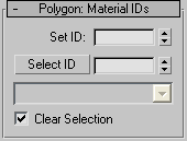 Selects polygons corresponding to the Material ID specified in the adjacent ID field. Type or use the spinner to specify an ID, then click the Select ID button.