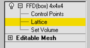 - At this sub-object level, you can position, rotate, or scale the lattice box separately from the geometry. If the Auto Key button is turned on, the lattice becomes animated. When you first apply an FFD, its lattice defaults to a bounding box surrounding the geometry. Moving or scaling the lattice so that only a subset of vertices lie inside the volume makes it possible to apply a localized deformation.