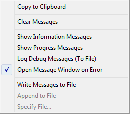 Clears messages from the window. This is the same as clicking Clear on the main window.