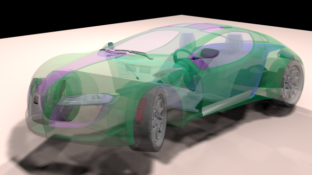 Car rendered with a transparent body to show interior parts. Shadows show transparency as well.