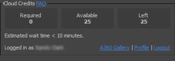 - Click to log in to the Autodesk Cloud. Once you are logged in, this panel shows your resources, estimated wait time, and links to the Autodesk Rendering interface.