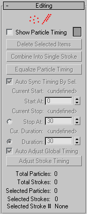The Editing rollout lets you delete unwanted particle seeds or whole strokes, adjust stroke/particle timing, and select particles/strokes and pass the selection data to the Birth Paint and Placement Paint operators. You cannot directly manipulate selected particle seeds with standard 3ds Max tools such as Move and Rotate.