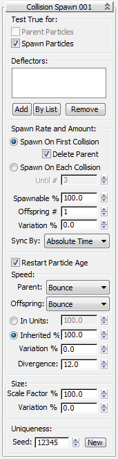 • Spawn On First Collision Particles spawn only the first time they collide with a deflector.