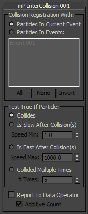 When this first option is set to Particles In Current Event, the test checks for collisions in the event in which the mParticles InterCollision test resides. In some cases, particles in the current event might collide with nearby particles after the latter have already moved on to another event; if this option is active, such collisions would not register.