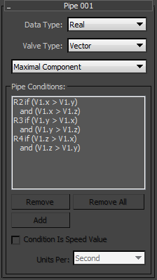 The list box in the Pipe Conditions group displays the conditions used to determine which data input gets piped through. For all valve types except Boolean, these are ranges based on values you specify. By default, if the valve type is not Boolean, a single condition (and input) exists, and is set to All, meaning that the input data is simply piped through. By adding conditions with the Add button, more