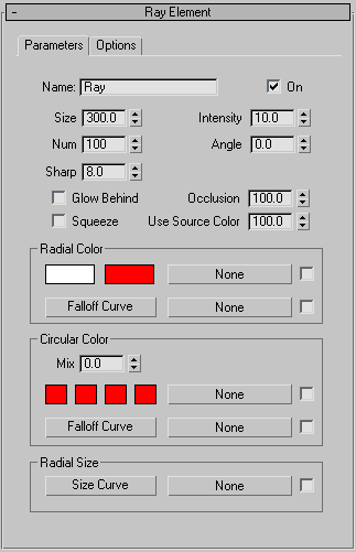 Rays are bright lines that radiate from the center of the source object, providing the illusion of extreme brightness for the object. Rays let you emulate scratches in the lens elements of a camera.