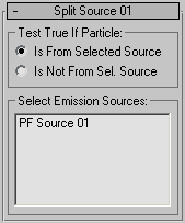 The Split Source test lets you split the particle stream based on particles' origin. You can specify that particles from one or more specific Particle Flow sources should or should not be eligible for redirection to the next event.