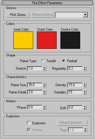 You must assign an atmospheric apparatus to a fire effect before you can render the effect. Use buttons in the Gizmos area to manage the list of apparatus objects.