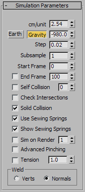 The Simulation Parameters rollout settings let you specify general properties of the simulation such as gravity, start and end frames, and sewing-spring options. These settings apply to the simulation on a global scale, that is, to all objects in the simulation.