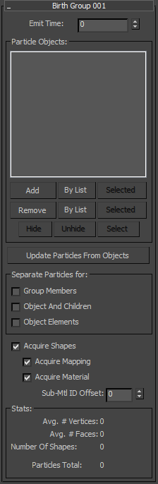 When acquiring a material for particles from the Particle Objects, the operator creates a Multi/Sub-Object material (to combine all materials from the Particle Objects), and assigns it to the event with the Birth Group operator. If, down the Particle Flow stream, different events merge, a collision of material IDs can occur if upstream events use the same material IDs. To resolve this situation, you can adjust the Sub-Mtl ID Offset value to shift the sub-material IDs assigned to the particles. For details, see Material Inheritance