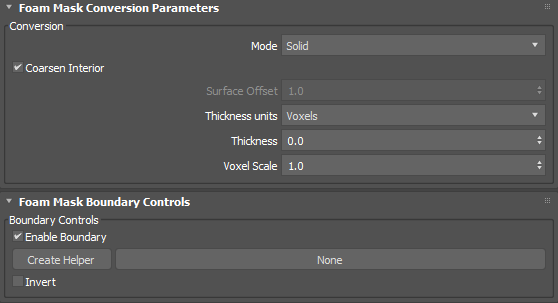 All foam masks in a simulation are converted to voxels, which are then used to determine whether a region is inside the corresponding volume or not. The Conversion options control how the associated masks gets voxelized. For foam masks, the base width of each voxel is the product of the Master Voxel Size setting in the Simulation Parameters, and the Voxel Scale setting in this panel.