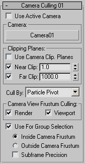 These controls let you specify whether to cull particles in the viewports or when rendering, both, or neither. The camera frustum the volume of space that the camera sees, usually a truncated pyramid defined by the camera viewing angle plus near and far clipping planes.