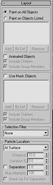 The settings on this rollout determine how the particles are placed on objects in the scene. The Layout settings affect all particle seeds associated with the Particle Paint helper, either before or after they are created.