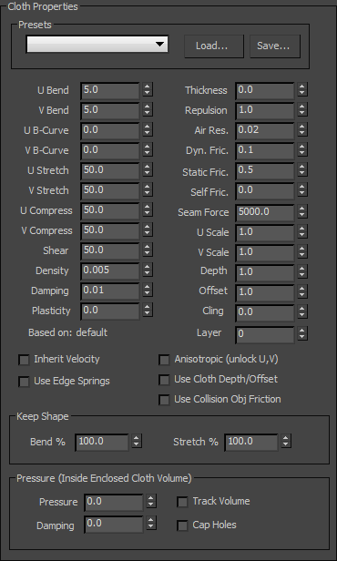 Sets the Cloth Properties parameters to the preset chosen from the drop-down list. Any presets that are built into the system or that have been previously saved and loaded will show up here.
