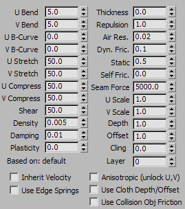 If you turn on Use Panel Properties (see Object Properties Dialog (Cloth)), 3ds Max disables the global settings in this group. Setting properties locally for panels is useful mainly when you are modeling a multi-panel garment created by the Garment Maker modifier.
