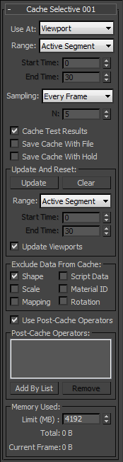 - Determines how often the Cache Selective operator samples and caches the animation. Default=Every Frame.