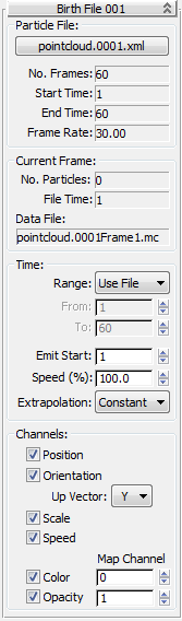 Contains a button that shows the name of the XML point-cloud file that defines the particle-birth parameters; to choose a different file, click the button and use the file dialog that opens. This group also contains read-only, basic data about the particle file, including the total number of frames, start and end times, and the animation frame rate.