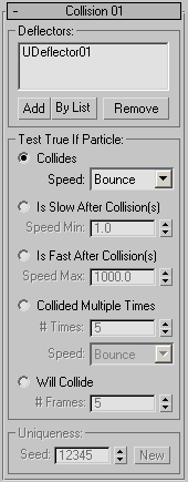 Collision tests for particles that collide with one or more specified Deflector space warps. It can also test whether a particle has slowed down or sped up after one or more collisions, has collided more than once, and even whether it will collide with a deflector in a specified number of frames.
